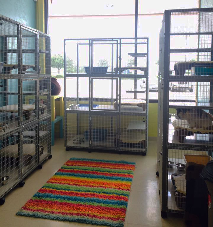 For kitties, we have deluxe cat condos. Each condo has two shelves covered in fleece bedding for your cat to relax and sleep on. Each cat is also provided with a private litter box and fresh food and water at all times. All cat condos are in our “cat room” so each cat can be let out one at a time to exercise and play.